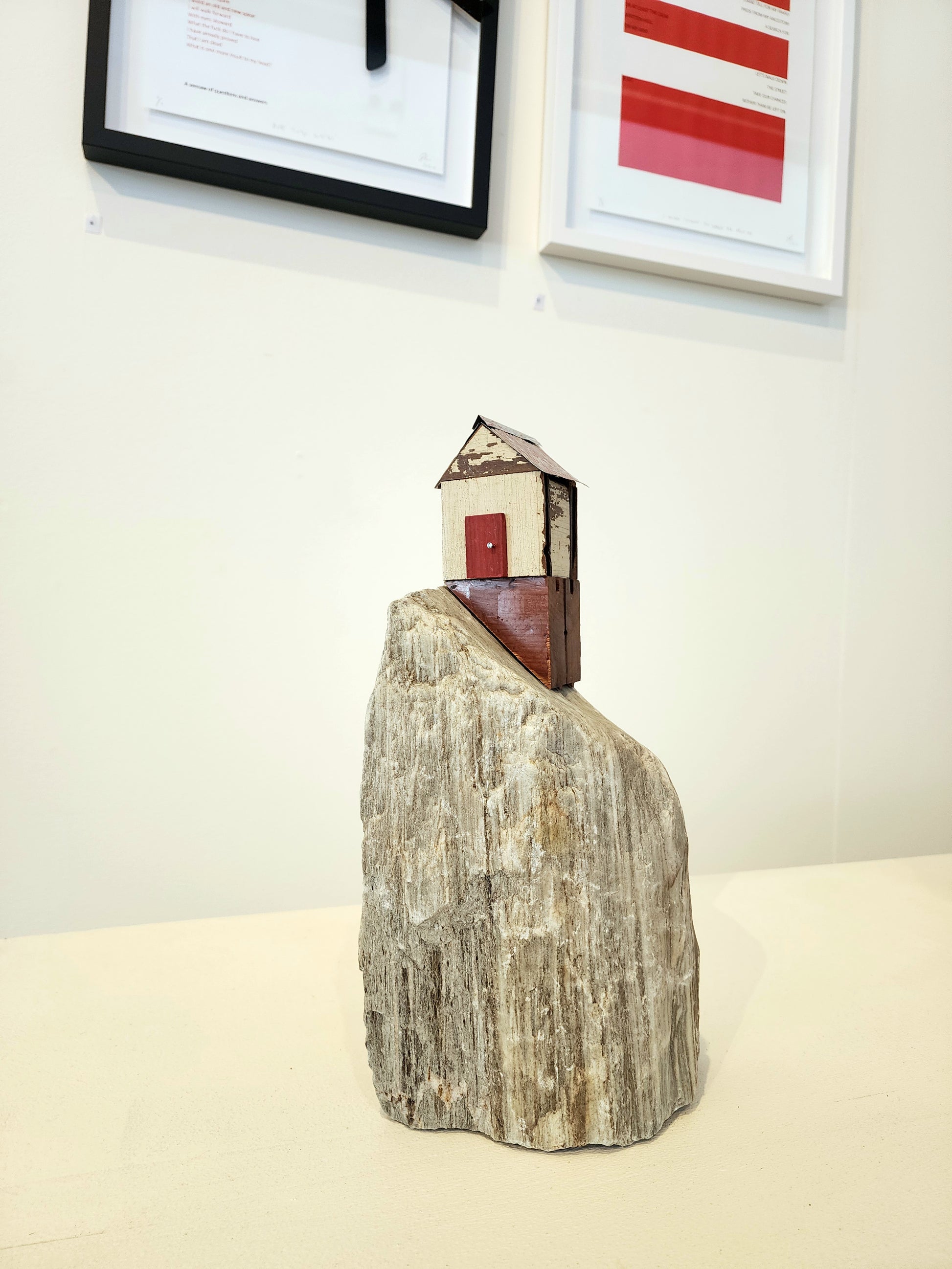 This sculpture is made from reclaimed Rimu timber, recycled tin, and schist rock